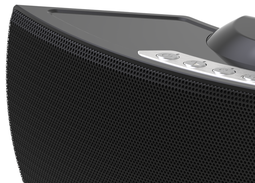 A Korus speaker with a remote control.