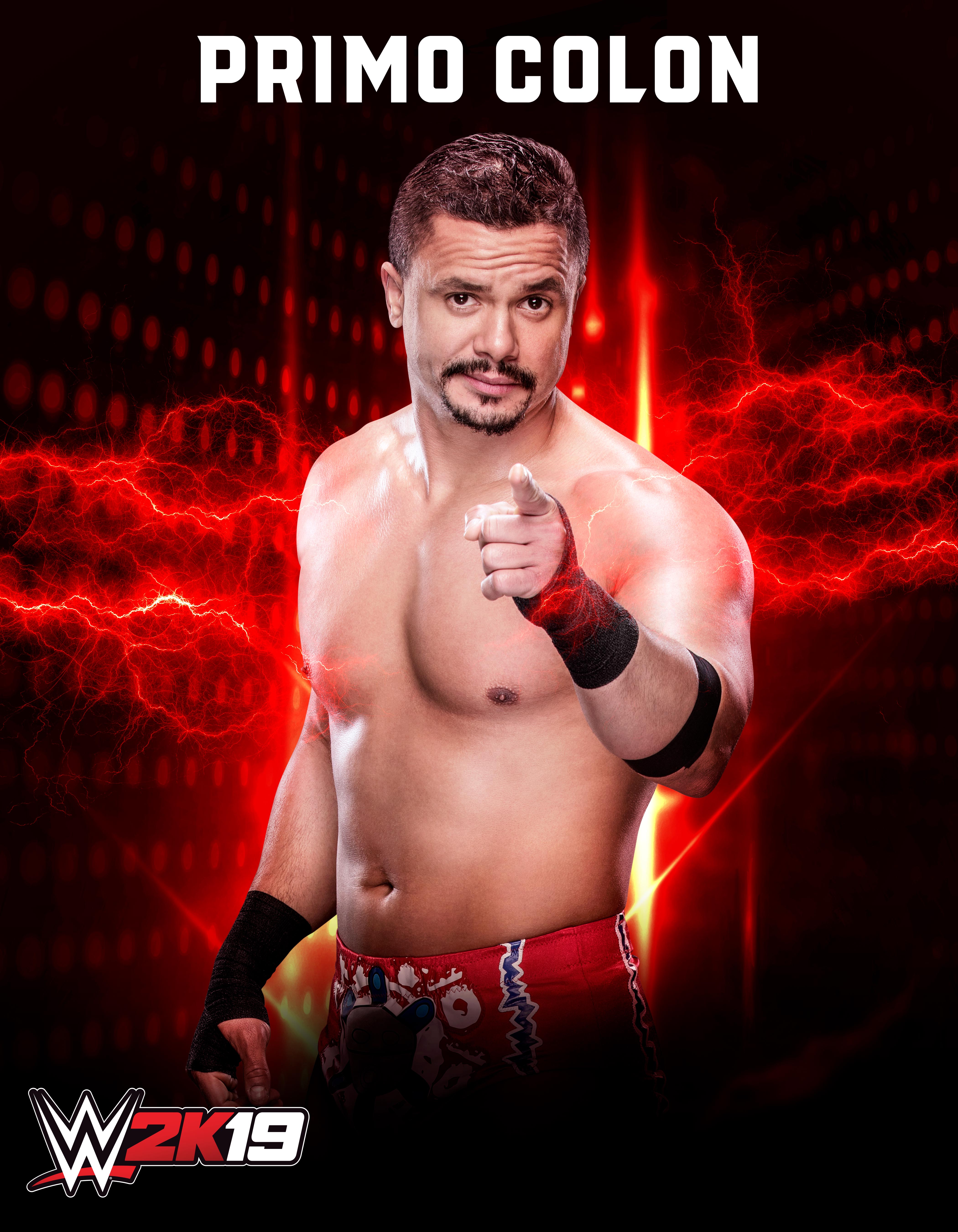 WWE champion Primo Colon on a red background, alongside fellow WWE Superstars from the Second Wave in the game WWE 2K19.