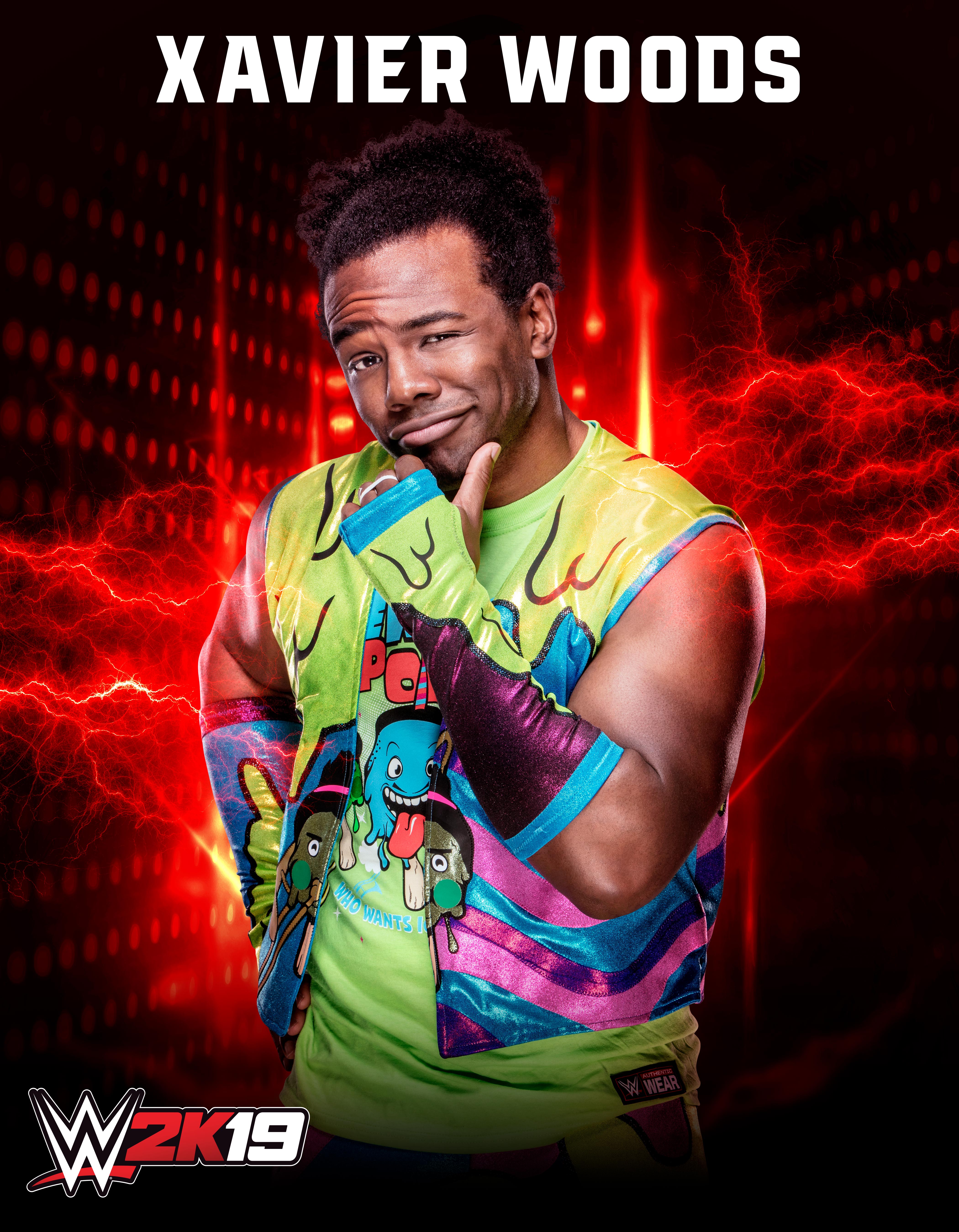 In WWE 2K19, Xavier Woods, one of the WWE Superstars, strikes a pose in front of a vibrant red light during the Second Wave.