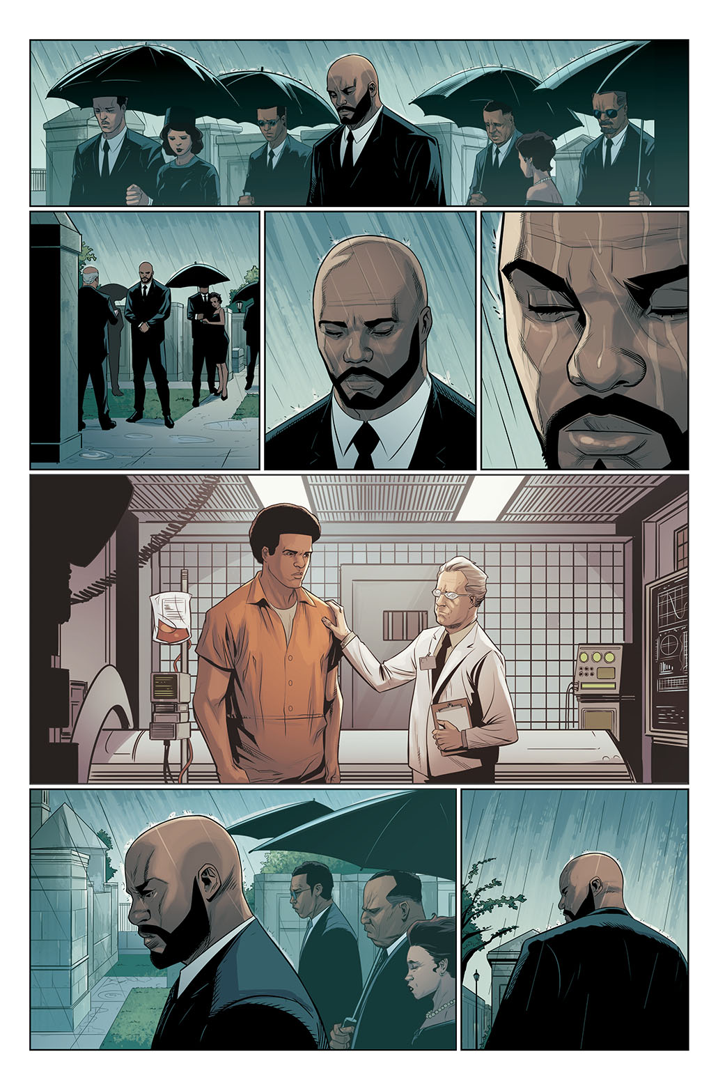 A comic page featuring Luke Cage, the man with superhuman strength, donning a sharp suit and wielding an umbrella in style.