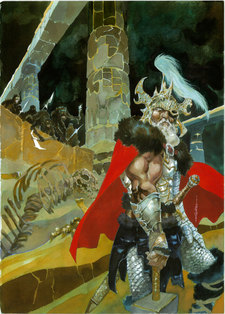 A painting inspired by Thor, depicting a man with a sword and cape.